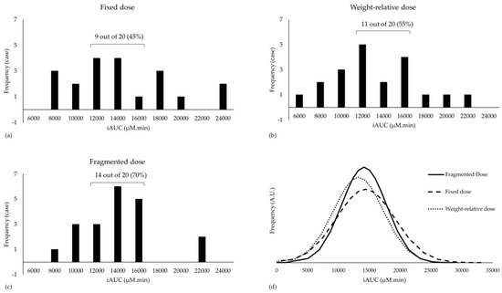 The CV% in iAUC when ingesting a fixed and a weight-relative dose was 33% and 31%, respectively. However, the CV% was somewhat smaller when the fragmented dose was ingested (26%). The CV% in Cmax was independent of the dosing strategy (34%–36%). This result suggests that a more homogenous plasma response is induced with a fragmented dose compared to the two other dosing strategies in our cohort. This finding is strengthened by evaluation of the histograms (Figure 3). Indeed, following the fragmented dosing strategy, 70% of our cohort had a pharmacokinetic response between 11,000 and 17,000 µM×min, which is about 20% lower or higher than the mean (Figure 3c). In contrast, only 45% and 55% had an iAUC between 11,000 and 17,000 µM×min in the fixed (Figure 3a) and the weight-relative dosing condition (Figure 3b), respectively. Similarly, the plotted normality curves based upon our data further support the statement that the fragmented dosing strategy is most likely to induce a more homogeneous plasma response (Figure 3d). Lastly, the ratio between the lowest and highest iAUC measured was 2.62 following the fragmented dose, while this was 3.16 and 3.30 for the fixed dose and weight-relative dose, respectively.