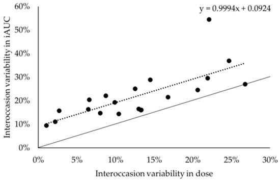 The intraindividual variation is estimated to be ± 9% (Figure 4). This is based upon the regression y = 0.999 x + 9% (r² = 0.539; p < 0.001), where y was the interoccasion variability in iAUC and x is the interoccasion variability in dose. This suggests that when the dose would remain constant (x = 0) the variation in iAUC would be about 9%.