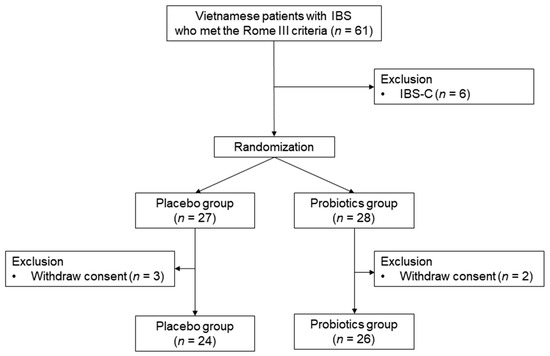 Sixty-one patients were diagnosed with Rome III criteria of IBS. Three patients from the probiotics group and three from the placebo group were excluded because they had constipation-predominant IBS. A total of 55 patients who met the inclusion criteria were randomized. We further excluded two patients from the probiotics group and three from the placebo group due to the withdrawal of consent. Finally, 26 patients received multi-strain probiotics and 24 received placebo (Figure 2).