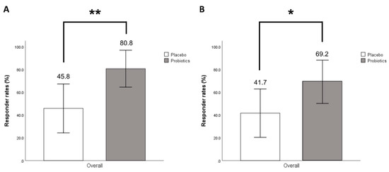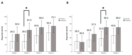 Overall responder rates assessed by VAS scores were also significantly higher in the probiotics group than in the placebo group (69.2% vs. 41.7%, p = 0.048) (Figure 3B). Serially, both groups demonstrated significant improvements in SGA scores and reductions of VAS scores during the entire treatment period, most notably in the probiotics group. At week 2 in SGA and week 3 in VAS score, the weekly responder rates were distinguishably different. However, the difference in other weekly responder rates did not reach statistical significance (Figure 4).