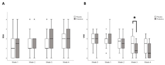 Figure 5A,B shows the changes in SGA and VAS scores. After 4 weeks, the mean SGA scores were 2.0 (1.0–2.7) and 2.0 (1.0–3.0) in the placebo and probiotics groups, respectively (p = 0.19). Relative to baseline, the mean VAS scores were changed from 4.0 (3.0–5.0) to 3.0 (1.0–4.0) in the placebo group and 4.0 (2.7–5.0) to 1.0 (0.0–3.0) in the probiotics group (p = 0.09).