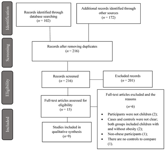 We used the Population, Intervention, Comparison, Outcomes, and Study (PICOS) design tool to formulate the question and facilitate the literature search [15]. We conducted a literature search for all kinds of studies providing data on differences in miRNAs expression between children and adolescents with obesity and its related cardiometabolic diseases and controls. The studies were considered eligible for their inclusion if they met the following criteria: (1) the participants were between 3 and 19 years old; (2) they provided the quantified expression of miRNAs in the case and control groups; (3) the population of the studied group had overweight/obesity and/or associated metabolic diseases, such as T2D, insulin resistance (IR), NAFLD, and/or CVD risks factors; and (4) they were case and control studies or intervention studies. Studies that were not written in English or were gray literature, as well as reviews, editorials, opinions, letters, and meeting abstracts, were excluded.