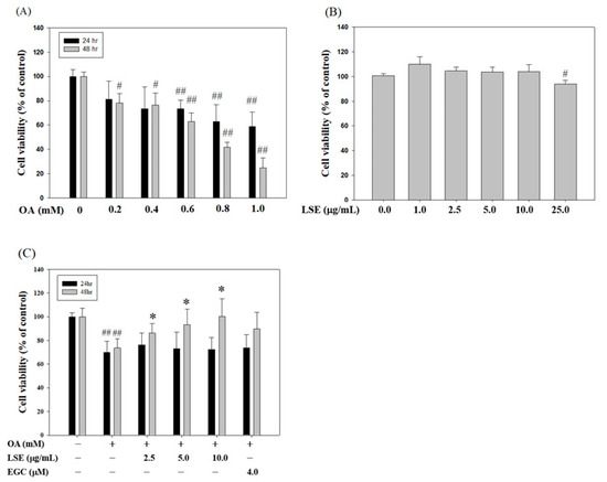 The trypan blue dye exclusion assay was used to evaluate the effect of the test drugs on cell viability, as described previously [25], and to determine the non-cytotoxic concentrations. Cells were seeded at a density of 105 cells/mL and treated with OA (0.6 mM) in the presence or absence of LSE or EGC at various concentrations for 24 h or 48 h. Afterward, the cells were stained with trypan blue, and live cells were enumerated to determine % cell growth.
