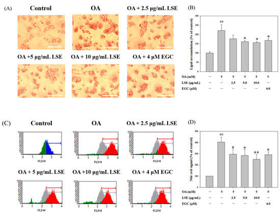OA is a monounsaturated fatty acid in which inadequate metabolism induces an adverse cellular response termed lipotoxicity [9,31]. Lipotoxicity is a metabolic syndrome that is caused by the accumulation of lipids in the liver and leads to cellular dysfunction and death [32]. As shown in Figure 2, the lipid contents of HepG2 cells were examined by oil red O (Figure 2A,B) and Nile red staining (Figure 2C,D), respectively. When the cells were treated by OA at 0.6 mM, cellular steatosis was successfully induced with a statistical difference in the absorbance compared with the control group (Figure 2B). The data of Figure 2B also showed that treatments of LSE dose-dependently inhibited intracellular lipid accumulation. These results were further confirmed by Nile red staining. OA treatment alone caused a significant increase in lipid accumulation (Figure 2C). As shown in Figure 2D, the OA-induced increases in levels of lipid accumulation were reduced by 35.5%, 39.1%, and 50.7% in 2.5, 5, and 10 μg/mL of LSE, respectively, as compared to OA treatment. It is noteworthy that the inhibitory effect of EGC at 4 μM on lipid accumulation was similar to LSE at 5–10 μg/mL (Figure 2).
