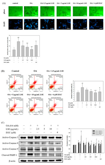 Effects of LSE or EGC on OA-induced HepG2 cell apoptosis. HepG2 cells were treated with or without OA (0.6 mM) in the presence or absence of LSE (2.5, 5, and 10 μg/mL) or EGC (4 μM) for 48 h. (A) The apoptotic cells were assayed by the 4,6-diamidino-2-phenylindole (DAPI) assay. Apoptotic values were presented as the percentage of apoptotic cells divided by the total number of cells. Images were taken at 100× magnification; scale bar, 30 μm. (B) Quantification of early and late apoptosis cells was analyzed by flow cytometry using annexin V-fluorescein isothiocyanate (FITC) and 7-amino-actinomycin (AAD) double staining. The proportion of annexin V-positive cells is represented as mean ± SD (n = 3) of three independent experiments. (C) The protein levels of active-caspase-3, active-caspase-8, active-caspase-9, and cleaved PARP-1 were analyzed by Western blotting. β-actin served as an internal control. (D) The mitochondrial membrane depolarization was assayed by JC-1 staining with flow cytometry. Depolarization levels were presented as percentage of depolarization cells divided by the total number of cells. (E) The protein levels of cytosol and mitochondria cytochrome c (cyt. c) were analyzed by Western blotting. β-actin and COX IV (cytochrome c oxidase IV) respectively served as an internal control of cell cytosol and mitochondria. (F) The protein levels of Bcl-2 and Bax were analyzed by Western blotting. β-actin served as an internal control. The quantitative data were presented as mean ± SD of three independent experiments. # p < 0.05, ## p < 0.01 compared with control via Student’s t-test. * p < 0.05, ** p < 0.01 compared with the OA group via one-way ANOVA with post-hoc Dunnett’s test.