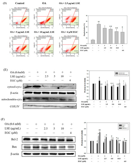 To investigate whether the LSE protection against OA occurred because it inhibited apoptotic pathways, we further studied the changes in expressions of active-caspase-3 (p17), active-caspase-8 (p18), active-caspase-9 (p35), and cleaved-poly (ADP-ribose) polymerase 1 (c-PARP-1), markers of apoptosis, in the HepG2 cells (Figure 5C). Stimulation with OA significantly induced the activation of these caspases and cleavage of PARP-1, compared to that of the control group. After exposure to OA for 48 h, LSE or EGC treatments inhibited these protein expressions, with higher concentrations being more effective (Figure 5C). One of the most significant events in apoptosis is mitochondrial dysfunction. Loss of mitochondrial transmembrane potential (MTP) elicits the mitochondrial release of cytochrome c (cyt. c) to cytosol [34]. In Figure 5D,E, OA-induced mitochondrial membrane depolarization of HepG2 cells and release of cyt. c from mitochondria to cytosol were decreased by LSE or EGC. Furthermore, it is evident that the pro-apoptotic protein Bax plays an essential role in the onset of MTP changes and induces cyt. c release, which is inhibited by the anti-apoptotic protein Bcl-2 [34]. Previous studies have also showed that the Bax/Bcl2 ratio is increased during apoptosis [34,35]. As shown in Figure 5F, OA-induced increase in the Bax/Bcl2 ratio was also revered by LSE or EGC. Our results implied that LSE and EGC can decrease OA-induced HepG2 cell apoptosis involving the mitochondrial pathway.