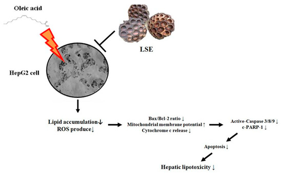 NAFLD is a chronic liver disease described by hepatic steatosis, and oxidative stress is considered as an important factor in NAFLD pathogenesis. To date, inhibition of hepatic lipid accumulation and oxidative stress is an attractive strategy for clinical therapy of NAFLD. Previous studies have addressed that palmitic acid (PA), a saturated non-esterified fatty acid, is a considerable cytotoxic agent on hepatoma cell lines and human hepatocyte primary cultures [36]. Studies have also shown OA to be less toxic than PA and to prevent/attenuate PA hepatocytes’ toxicity in steatosis models in vitro [37]. Therefore, to avoid that differential or opposite effect of OA and PA on lipid accumulation and apoptosis, a 48-h treatment of OA at a lower dose of ≤0.6 mM, which has shown less and significant cytotoxicity to HepG2 cells, was then applied in all subsequent experiments. As expected, our data showed that the number of lipid droplets and the content of the oil red O lipid were increased significantly in the OA-induced HepG2 cells, indicating the hepatic steatosis model in vitro was successfully established. By spectroscopic and biochemical methods, we further concluded that LSE reduced OA-induced hepatic lipotoxicity through inhibition of lipid accumulation and ROS production. The possible inhibitory pathways of LSE on OA-mediated lipotoxicity were primarily interfering apoptotic pathways, including decreases in (i) Bax/Bcl2 ratio; (ii) MTP elicits the mitochondria release of cyt. c to cytosol; (iii) protein levels of active-caspase-3/8/9 and c-PARP-1. To summarize, we proposed a schematic presentation of possible mechanisms for the inhibitory effect of LSE on the OA-induced hepatic lipotoxicity of HepG2 cells (Figure 6).