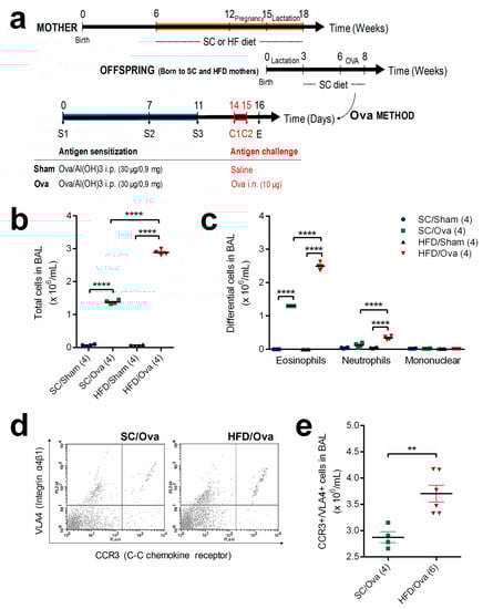 Leukocyte infiltration in the bronchoalveolar lavage (BAL) of mice born to HFD-fed mothers. The offspring born to SC- and HFD-fed mothers were subjected to sensitization only (SHAM) or sensitization and challenge with ovalbumin (OVA) (a). BAL samples were obtained from SC/SHAM, SC/OVA, HFD/SHAM and HFD/OVA and processed for total (b) and differential leukocyte counting (c). BAL samples from SC/OVA and HFD/OVA were also processed for flow cytometry quantification of CCR3+/VLA4+ cells (d,e). Data are shown as mean ± SEM. ** p < 0.01 and **** p < 0.0001.