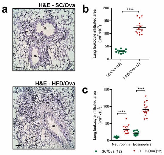 Leukocyte infiltration in the lung parenchyma of mice born to HFD-fed mothers. Lung tissue samples from SC/OVA and HFD/OVA were processed for hematoxylin and eosin (H&E) staining to visualize morphological aspects (a). The total leukocyte infiltrated area (b) and the neutrophil and eosinophil infiltrated area around the bronchial alveolar space (c) were determined using ImageJ software. Horizontal bars represent 50 µm. Data are shown as mean ± SEM. **** p < 0.0001. Br: Bronchiole; V: Vessel.