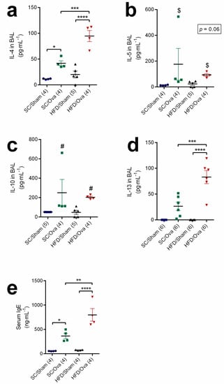 As with the BAL level of IL-4, the serum level of IgE was elevated by challenge with OVA in the SC/OVA and in the HFD/OVA (respectively, 575% and 981% higher than in SC/SHAM and HFD/SHAM; p = 0.03 and p < 0.0001). However, the IgE level of HFD/OVA was higher than in SC/OVA (119% higher; p = 0.004) (p = 0.012 for interaction) (Figure 3e).