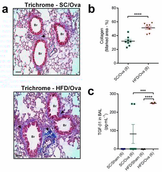 Lung collagen deposition and TGF-β1 level in mice born to HFD-fed mothers. Lung tissue samples from SC/OVA and HFD/OVA were subjected to the Masson’s trichrome staining protocol to assess collagen deposition. Representative images show peri-bronchoalveolar blue-stained collagen fibers (black arrows) (a). The percentage of stained area was assessed with Image-Pro Plus software (b). BAL samples were obtained from SC/SHAM, SC/OVA, HFD/SHAM and HFD/OVA mice and processed for TGF-β1 quantification (c). Horizontal bars represent 50 µm. Data are shown as mean ± SEM. *** p < 0.001 and **** p < 0.0001. Br: Bronchiole; V: Vessel.