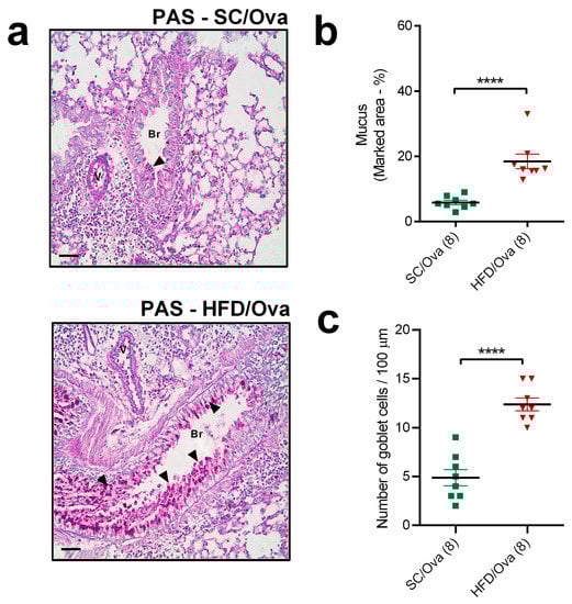 The PAS method also revealed that both groups of mice challenged with OVA presented purple-magenta staining for mucus over the epithelial layer. This indication of mucus production was exacerbated in HFD/OVA, as evidenced by the quantification of the percentage of purple-magenta-stained area (214% higher than in SC/OVA; p < 0.0001) (Figure 5a,b). The number of globet cells in the bronchioles was also increased in HFD/OVA mice (150% higher than in those of SC/OVA; p < 0.0001) (Figure 5c).