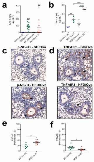 We also evaluated two intracellular proteins that take part in the cellular signaling evoked by TNF-α. The area stained for phosphorylated NF-κB was higher in lung sections of HFD/OVA than in SC/OVA (71% higher; p = 0.02) (Figure 6c,e). On the other hand, the area stained for TNFAIP3, a repressor of TNF-α signaling, was reduced in lung sections of HFD/OVA (60% lower than in SC/OVA; p = 0.03) (Figure 6d,f).