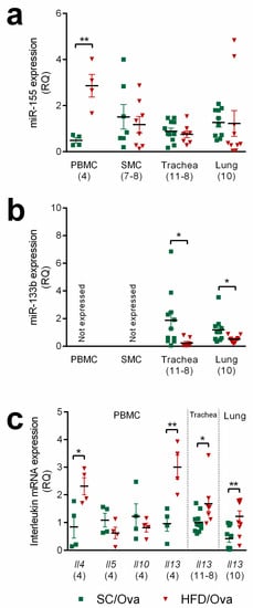 The choice for the study of miR-155 was based on consistent literature showing its participation in the TH2 response of allergic airway disease. Mice knockout for miR-155 exhibited attenuated eosinophil infiltration in the lung parenchyma, reduced mucus production and lower IL-4, IL-5 and IL-13 levels when subjected to OVA sensitization and challenge []. Concordant data using mice knockout for miR-155 were found by other groups [,]. Accordingly, miR-155 overexpression resulted in increased mucus production, lung eosinophil infiltration and IL-4, IL-5 and IL-13 levels []. Directly inhibiting miR-155 expression in TH2 cells prevents TH2-mediated airway allergy (airway eosinophilia, IL-13 production and airway mucus production []). miR-155 expression was also described to be positively associated in IL-4, IL-5 and IL-13 production by CD4+ cells isolated from allergic patients []. On the other hand, miR-155 was reported to reduce IL-13-induced bronchial smooth muscle cells proliferation and migration []. Therefore, we decided to evaluate miR-155 expression not only in peripheral-blood mononuclear cells (PBMCs) and in splenic mononuclear cells (SMC), but also in lung and trachea of HFD/OVA and SC/OVA mice.