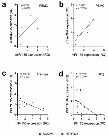 Correlation of interleukin expression with miRNAs in mice subjected to sensitization and challenge with OVA. The expression miR-155 in PBMC of SC/OVA and HFD/OVA was correlated with Il4 (a) and Il13 (b) expressions. The expression miR-133b in trachea (c) and in lung (d) of SC/OVA and HFD/OVA was correlated with Il13 expression.
