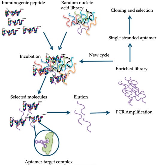 Schematic representation of the different steps in the systematic evolution of ligands by exponential enrichment (SELEX) procedure, modified from Banerjee [136] and Stoltenburg et al. [125,133].
