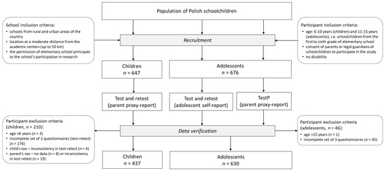 The study was conducted in Poland in autumn 2016. The recruitment was carried out in elementary schools (not randomly selected) located across the whole country, covering rural and urban areas (Figure S1). Inclusion criteria for schools were location at a moderate distance from the academic centers (up to 50 km) and the permission of school principals for the school’s participation in research (Figure 1). Schoolchildren from the first to sixth grade of elementary schools were invited to take part in the study. The self-administered questionnaire was administered in a paper format. The questionnaire was completed with a two-week interval—twice by parents for their children (test–retest for children), twice by adolescents themselves (adolescent’s test–retest), and once by the adolescents’ parents (testP) (Figure 1). In line with previous studies [17,18,19,20,21], the two-week interval was chosen as long enough to avoid recalling previous responses, but short enough to avoid real changes in dietary behaviors, lifestyle, or nutrition knowledge in schoolchildren. Dietary behaviors of schoolchildren, especially adolescents, can change more rapidly than adults [4,5,6].
