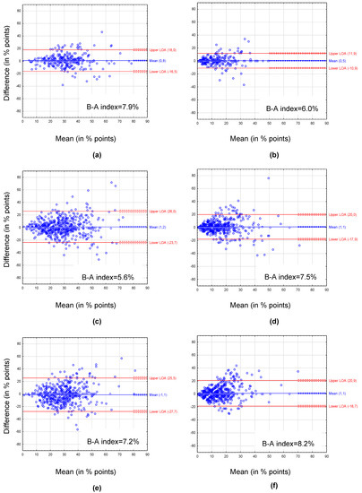 - Bland, J.M.; Altman, D.G. Statistical methods for assessing agreement between two methods of clinical measurement. Lancet 1986, 1, 307–310. [Google Scholar] [CrossRef]