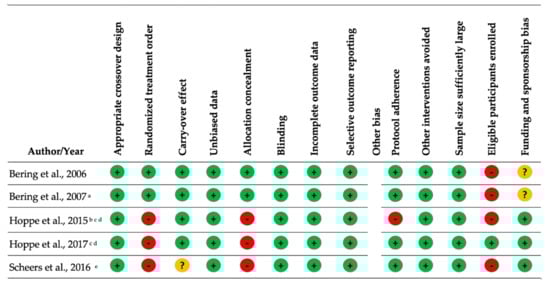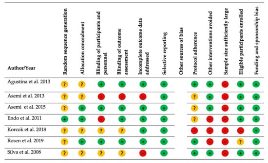 - Higgins, J.P.; Altman, D.G.; Gøtzsche, P.C.; Jüni, P.; Moher, D.; Oxman, A.D.; Savovic, J.; Schulz, K.F.; Weeks, L.; Sterne, J.A.; et al. The Cochrane Collaboration’s tool for assessing risk of bias in randomised trials. BMJ 2011, 343, d5928. [Google Scholar] [CrossRef] [PubMed]