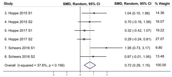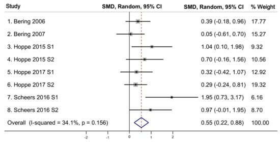 | Number of Studies | Model | Effect: Pooled SMD | 95% CI | p-Value | Q | p-Value | Tau Squared |