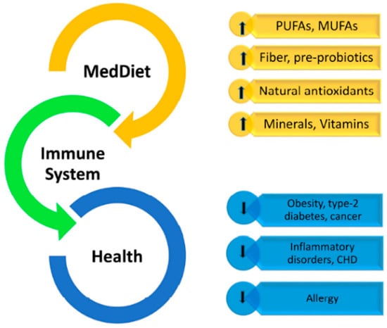 Vitamins and trace elements are also involved in the maintenance of the immune response. The Mediterranean dietary pattern is not only exemplified as a prudent choice of lifestyle, but also as a scientifically accepted mechanism that helps to preserve human health and protect against major chronic diseases. Mediterranean-style diets are considered beneficial for the prevention and/or treatment of obesity, type-2 diabetes, and inflammatory disorders [].