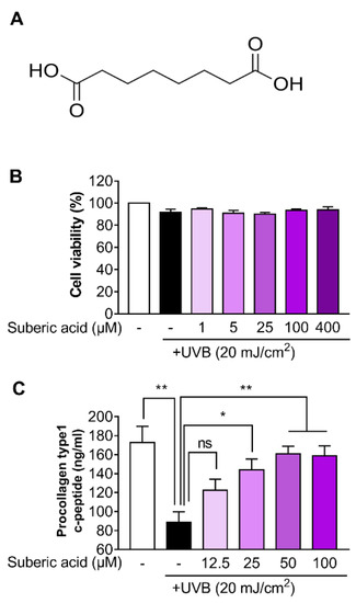 The structure of suberic acid is shown in Figure 1A. We found that suberic acid (up to a concentration of 400 µM) showed no toxicity against UVB-induced Hs68 cells according to MTT assay results (Figure 1B). We also examined whether suberic acid could attenuate collagen loss in UVB-exposed Hs68 cells. Suberic acid significantly reversed procollagen I C-terminal peptide reduction in UVB-exposed Hs68 cell supernatants in a dose-dependent manner, which was saturated around 50 μM (Figure 1C).
