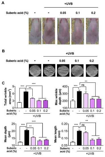 3.2. Suberic Acid Reduces UVB-Induced Wrinkle Formation in Hairless Mice