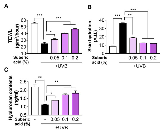 Suberic acid prevents UVB-Induced skin dryness in hairless mice. The effect of three dietary suberic acid concentrations (0.05%, 0.1% and 0.2%) on (A) Transepidermal water loss (TEWL) and (B) skin hydration on the back of hairless mice exposed to UVB for 10 weeks. (C) Changes in skin hyaluronic acid concentration following 10 weeks of continuous dietary suberic acid administration in UVB-exposed hairless mice. Results are shown as means ± SEM (n = 8). Significant differences between groups are shown as * P < 0.05; ** P < 0.01; *** P < 0.001.