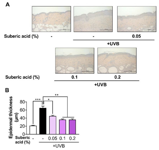 Suberic acid suppresses UVB-induced epidermal thickness increase. (A) Representative micrographs of hematoxylin and eosin (H&E) stained skin tissue sections after UVB irradiation for 10 weeks (Scale bar = 200 µm). (B) Epidermal thickness of the dorsal skin. Results are shown as means ± SEM (n = 8). Significant differences between groups are shown as * P < 0.05; ** P < 0.01; *** P < 0.001.