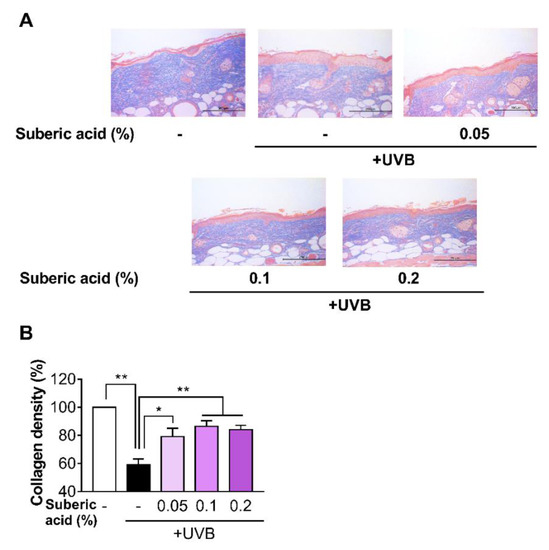 Suberic acid prevents UVB-induced collagen loss in hairless mouse skin. (A) Representative micrographs of skin tissue sections stained with Masson’s trichrome stain for collagen after UVB irradiation for 10 weeks (Scale bar = 200 µm). (B) Quantitative analysis of dermal collagen density. Results are shown as means ± SEM (n = 8). Significant differences between groups are shown as * P < 0.05; ** P < 0.01.