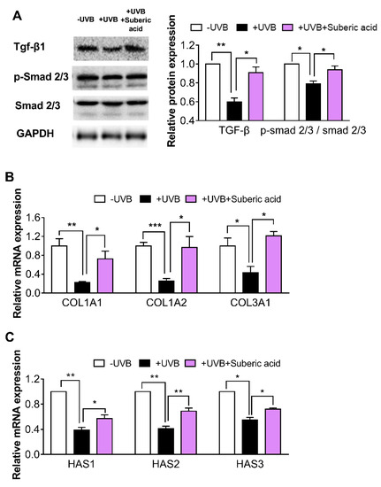 Suberic acid increases the levels of molecules involved in ECM synthesis in hairless mice skin. Effect of dietary suberic acid (0.1%) on (A) transforming growth factor-β1 (TGF-β1), p-SMAD, and SMAD 2/3 protein levels and (B) collagen type I alpha 1 chain (COL1A1), COL1A2, COL3A1, (C) hyaluronic acid synthase 1 (HAS1), HAS2, and HAS3 gene expression in the hairless mouse skin tissue. Results are shown as means ± SEM (n = 4–6). Significant differences between groups are shown as * P < 0.05; ** P < 0.01; *** P < 0.001.