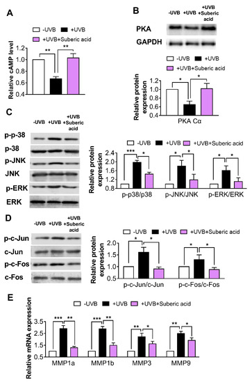 Suberic acid regulates the levels of molecules associated with ECM degradation in hairless mouse skin. Effect of dietary suberic acid (0.1%) on (A) cyclic adenosine monophosphate (cAMP) level, (B) protein kinase A catalytic subunit (PKA Cα), (C) p-p38, p38, p-c-Jun N-terminal kinase (p-JNK), JNK, p-extracellular signal-regulated kinase (p-ERK), ERK, (D) p-c-Jun, c-Jun, p-c-Fos, and c-Fos protein levels and (E) matrix metalloproteinase 1a (MMP1a), MMP1b, MMP3, and MMP9 gene expression in the hairless mouse skin tissue. Results are shown as means ± SEM (n = 4–6). Significant difference between groups are shown as * P < 0.05; ** P < 0.01; *** P < 0.001.