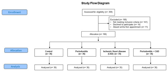After a first screening, 166 patients were excluded from the final sample because they did not meet the inclusion criteria (n = 141), declined to participate (n = 14), or did not attend the first appointment (n = 11). Finally, for this study, 36 patients with periodontitis, 35 patients with CAD, 36 patients with periodontitis plus CAD, and 36 healthy subjects were finally enrolled (Figure 1).