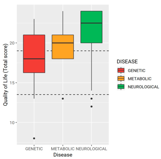 A statistically significant correlation was found between HRQoL and underlying NI-associated disease. Children with neurological disorders (cerebral palsy) had higher total HRQoL scores than those with genetic or metabolic diseases (excellent HRQoL in 79.5% vs. 34.6% patients, respectively, p = 0.001) (Figure 2). The age of the children at HEN beginning and the HEN programs’ duration showed no significant correlation with the HRQoL (p = 0.31 and p = 0.47, respectively). A multiple regression analysis regarding the HRQoL of NI children on HEN was also performed, and confirmed that children with cerebral palsy had a better HRQoL than children with genetic or metabolic diseases (β: 2.65, 95% CI 0.87–4.41, p = 0.005). Notably, a marginally significant negative correlation was found between HRQoL and the HEN programs’ duration (β: −0.19, 95% CI −0.40–0.03, p = 0.098), as the HRQoL score seems to decrease by 0.19 points for each year spent on HEN. Multiple regression models did not show further significant factors.