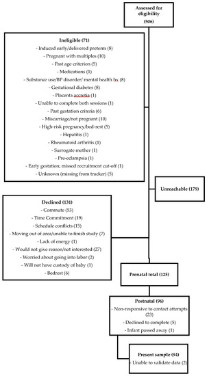 Data were collected as part of a larger longitudinal research project examining maternal health and infant development. The project was approved by the Idaho State University Human Subjects Committee (protocol 4191, entitled “Infant Development and Healthy Outcomes in Mothers Study”). Data were collected for 125 prenatal participants and 96 participants at 6 months postpartum (See Figure 1).