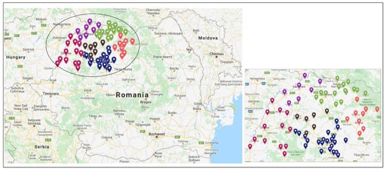 Settlements of sample recruitment, according to county, in northwestern Romania. The map was created with the Google Maps program. Legend: red dots—Bihor county; brown dots—Sălaj county; blue dots—Cluj county; purple dots—Satu Mare county; green dots—Maramureș county; orange dots—Bistrița-Năsăud county.