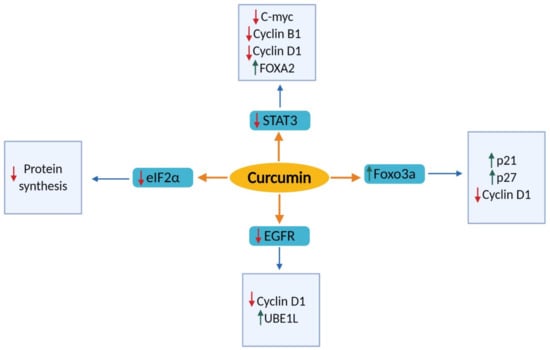 The above findings indicate that the anti-proliferative effects of curcumin against lung cancer are associated with the modulation of transcription factors, protein kinases, and cell cycle regulatory proteins as presented in Figure 1.