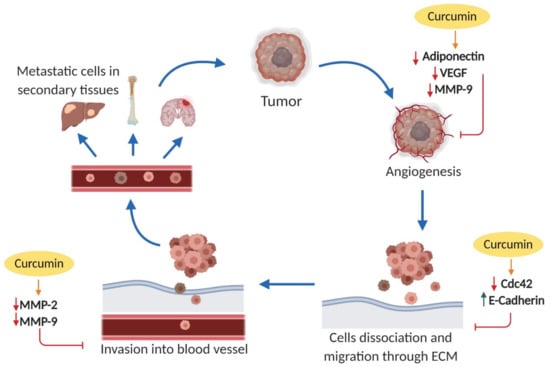 It has been shown that curcumin inhibits metastasis in lung cancer cells by modulating several molecular targets including Cdc42, E-Cadherin, matrix metalloproteinases (MMPs), VEGF, and adiponectin.