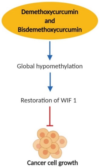 DNA methylation is a covalent DNA modification that occurs mostly at 5′ position of the cytosine residues within cytosine-phosphate-guanine (CpG) dinucleotides. Moreover, it may also occur at cytosine-phosphate-adenine (CpA) and cytosine-phosphate-thymine (CpT) dinucleotides. This reaction is catalysed by DNA methyltransferase (DNMT) and S-adenosyl-methionine (SAM) as the methyl donors [205]. There are two patterns of DNA methylation that have been observed in cancer cells which include global hypomethylation and localized hypermethylation [202]. Global hypomethylation at repetitive sequences could result in genomic instability that can favor mitotic recombination followed by deletions and translocations as well as chromosomal rearrangement. This leads to activation of proto-oncogenes and pro-metastatic genes which contribute to cancer development [206,207]. Localized hypermethylation at the CpG island promoter leads to transcriptional silencing of tumor suppressor and DNA repair genes, and the inability to regulate cell cycle control, apoptosis, cell adhesion, and metastasis [208]. It has been documented that curcumin exerts anti-cancer effects against leukemia [209], cervical [210,211], melanoma [212], breast [213], and prostate [214] cancer cells through global hypomethylation which reactivates the silenced tumor suppressor and DNA repair genes thus inhibits the cancer progression [215,216]. To date, there is no study reported on curcumin as a hypomethylating agent against lung cancer cells. However, other curcuminoids, namely demethoxycurcumin and bisdemethoxycurcumin have been shown to induce demethylation effect in NSCLC cell lines A549, H460 and SPC-A-1. In this study, the demethylating effect of curcumin leads to restoration of tumor suppressor gene Wnt inhibitory factor-1 (WIF1) expression whose promoter is hypermethylated and silenced in lung cancer cells and tissues (Figure 4). As a result of WIF-1 restoration, the Wnt pathway is downregulated causing inhibition of cancer cell growth [217].