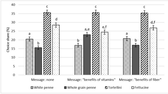 Diners choosing white penne, whole grain penne, tortellini, and fettuccine on the total, by treatment (% values, error bars represent standard errors). Different letters imply values significantly different at p < 0.05 probability level between products within the same treatment (Wilcoxon signed rank sum test) and between different treatments (Wilcoxon–Mann–Whitney test).