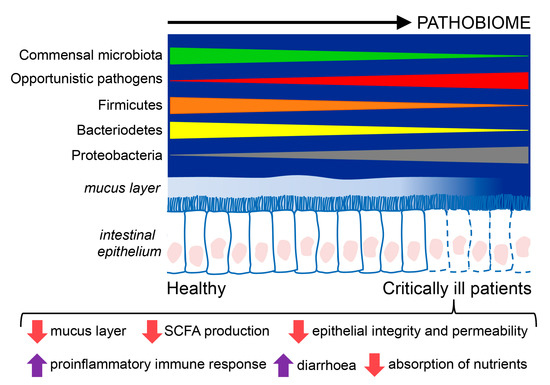 Composition and functions of the intestinal microbiome in critically ill patients compared to healthy individuals. Critically ill patients exhibit an intestinal disease-promoting microbiome or pathobiome. This pathobiome is characterized by a lower prevalence of the Firmicutes and Bacterioidetes phyla, and a higher prevalence of the Proteobacteria phyla, in contrast to healthy individuals. Furthermore, the intestinal epithelium is altered in critically ill patients, showing reduced reperfusion, that could lessen the hydrophobicity of the mucus layer and favor the translocation of pathogens through gaps between the epithelial cells, and epithelial apoptosis, resulting in poor absorption of nutrients, diarrhea, loss of fecal energy, and lower production of short chain fatty acids (SCFA).