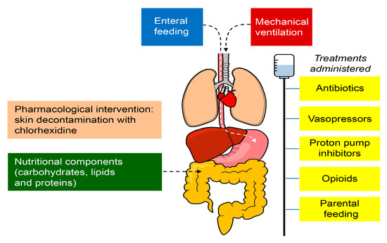 Moreover, nutrition is another key factor for the gut microbiome homeostasis since it primarily depends on the availability of enteral nutrients for survival. Thus, the nutritional components (carbohydrates, lipids, and proteins) and the route of administration (enteral/parenteral) might also alter the health of the microbiome [43,44,45]. In addition, pharmacological interventions can modify the specific conditions of the body site (for example, skin decontamination with chlorhexidine) and invasive procedures may alter the natural barrier mechanisms (e.g., endotracheal intubation, intravascular catheters) that could facilitate the access and proliferation of microbes [46]. The factors that may alter the microbiome are shown in Figure 2. Therefore, the impact of ICU care on the microbiome should be further explored.