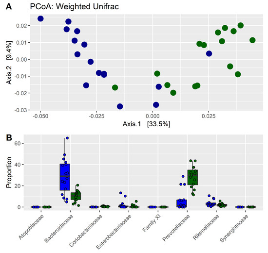 Microbial diversity and taxonomic composition in chronic kidney disease (CKD) patients and healthy control (HC) subjects: (A) principal coordinate analysis (PCoA) composition of taxonomic composition of fecal microbiota in CKD patients (blue dots) and controls (green dots), and (B) bacterial families frequencies in CKD patients (blue barplots) and controls (green barplots).