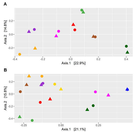 (A) PCoA plot of the fecal taxonomic composition of CKD patients before and after a 6 month dietary intervention. (B) PCoA plot of the fecal taxonomic composition of CKD patients before and after a 6 month dietary intervention comprising a low-protein diet (LPD) and intake of inulin. Samples collected before the dietary intervention are marked with a square, while samples collected after the dietary intervention are marked with a circle. Colors indicate the patients. We used weighted UniFrac metrics to compare the microbiota.