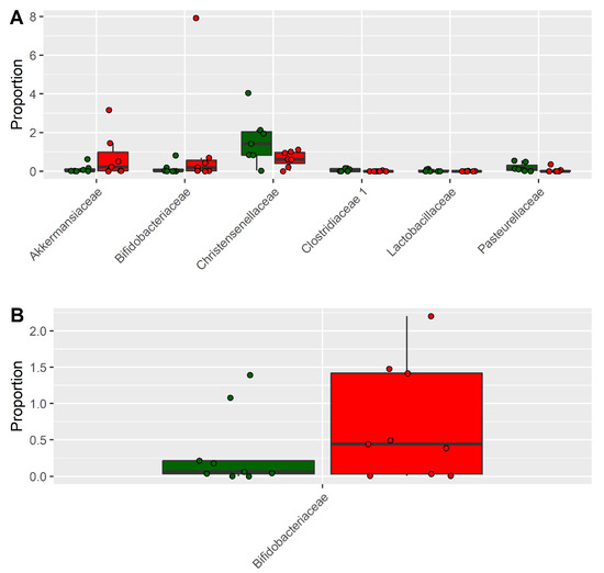 Taxa altered in CKD patients after 6 months of dietary intervention (A) or after 6 months of dietary intervention and intake of inulin (B). Y-axis shows the percentage of reads associated with bacteria families. Frequencies of bacteria before and after the intervention are reported in green and red, respectively.