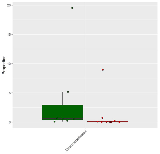 The effect on the fecal microbiota of CKD patients before and after a dietary intervention of 6 months was also analyzed. In detail, nine patients underwent a dietary intervention with the supplement of inulin, while seven patients were controlled only by dietary intervention. The PCoA plot of the seven patients following only the LPD showed that the microbiota of each patient before and after the treatment was similar (Figure 2A), indicating that the dietary intervention had a small effect on the microbiota of each subject. This result was also confirmed by the PERMANOVA test (p = 0.96; F = 0.40). The analysis conducted on the nine patients following LPD and inulin led to similar results (Figure 2B) (p = 0.99; F = 0.29). However, despite the high similarity, a differential abundance analysis identified six bacterial families, the abundance of which was statistically different after the treatment (Figure 3A, Supplementary Table S2A). The LPD was able to significantly increase the frequencies of Akkermansiaceae and Bacteroidaceae and decrease the frequencies of Christensenellaceae, Clostridiaceae, Lactobacillaceae, and Pasteurellaceae. Only Bifidobacteriaceae were increased when the LPD was accompanied by oral inulin intake (Figure 3B, Supplementary Table S2B). Furthermore, the inulin intake led to a significant reduction of the Enterobacteriaceae family. The patients following LPD and inulin intake showed a lower frequency of Enterobacteriaceae (0.33%) compared to the patients following LPD only (0.71%) (Figure 4, Table S2).