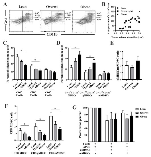 3.3. Increased Adiposity Induces the Expansion of Immunosuppressive Cell Populations and Reduces the Splenic CD8+ T Cell to MDSC Ratio