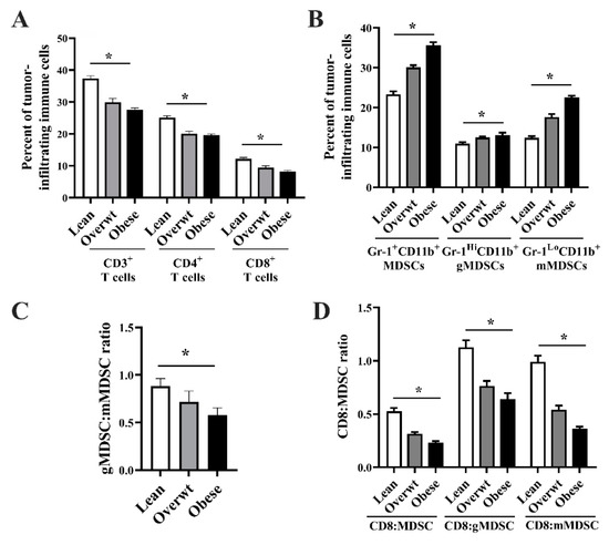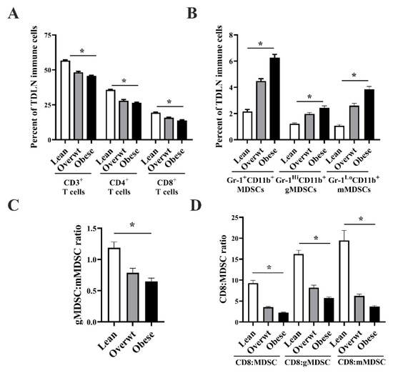 3.4. Increased Adiposity Induces the Expansion of Immunosuppressive Cell Populations and Reduces the CD8+ T Cell to MDSC Ratio in the Tumor-Draining Lymph Node and Tumor Microenvironment