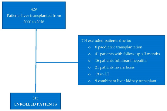 A total of 315 patients submitted to liver transplantation were enrolled in the study (Figure 1), the median age was 56 years (range 18–68), 68% were males, and the most frequent origin of LT was the hepatitis C virus, followed by alcohol abuse. Thirty-one patients (10%) were transplanted for NASH. Before LT, 18% of patients presented AH, 28% DM, and 12% dyslipidemia; a BMI ≥ 30 was present in 14% of patients. Seventeen percent of patients had at least two metabolic disorders. Demographic and clinical characteristics of patients at transplant are shown in Table 1.