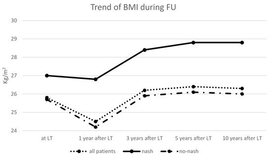 Weight gain after liver transplantation is welcome in patients transplanted with severe nutritional depletion; however, a rapid weight gain might be harmful. In our population, mean BMI at the time of LT was only slightly above normal values; however, these patients were likely overhydrated during end-stage liver disease; therefore, BMI was possibly overestimated. The majority of our patients were therefore normal or undernourished at transplantation. Mean BMI, in our series, showed a trend to decrease the first year after surgery and tended to recover later on. This result is at variance with studies showing a rapid and severe weight gain after liver transplantation [9,18,19]. This difference might depend on a lower prevalence of patients with NASH origin in our study (only 10%). Indeed, in the previously cited studies, the percentage of patients transplanted for NASH was much greater. In the 31 NASH patients in our series, we observed that BMI progressively increased from the first year after surgery was significantly higher at 3 and 5 years. A higher percentage of patients transplanted for NASH is therefore likely to modify the pattern of weight changes after LT throughout a more frequent development of post-transplant obesity. In this regard, bariatric surgery has been proposed before or concomitant to LT in patients with morbid obesity [20].